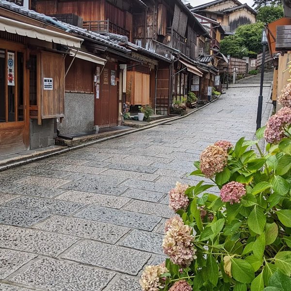 Es la más empinada de las dos y quizás la más famosa. Empedrada, angosta y bordeada por casas de madera que se remontan al periodo Taisho y anteriores, esta calle tiene un encanto teatral. Se accede desde el sur, viniendo desde Kodaiji o Yasaka. Aquí vas a encontrar una mezcla de tiendas que venden cerámica de Kiyomizu-yaki, abanicos pintados a mano, encuadernación artesanal y dulces típicos. En primavera, los faroles de papel y los cerezos crean una atmósfera de postal. Muchos turistas alquilan yukata o kimono para recorrer la zona y sacarse fotos entre las estructuras antiguas.